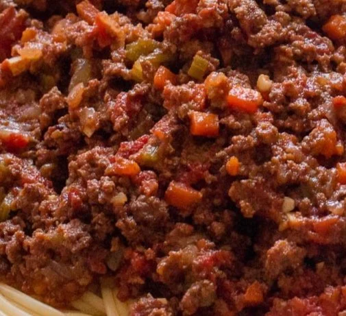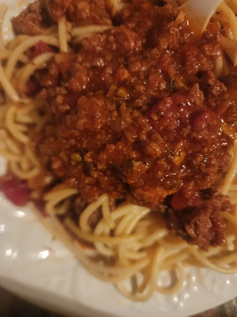 Whole grain spaghetti & meat sauce with vegetables & fruit with Milk.
